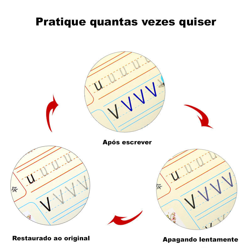 Com o novo caderno mágico seu filho(a) irá aprender caligrafia padrão e cursiva enquanto se diverte! Nosso kit é 100% reutilizável seu filho(a) vai poder praticar quantas vezes quiser.